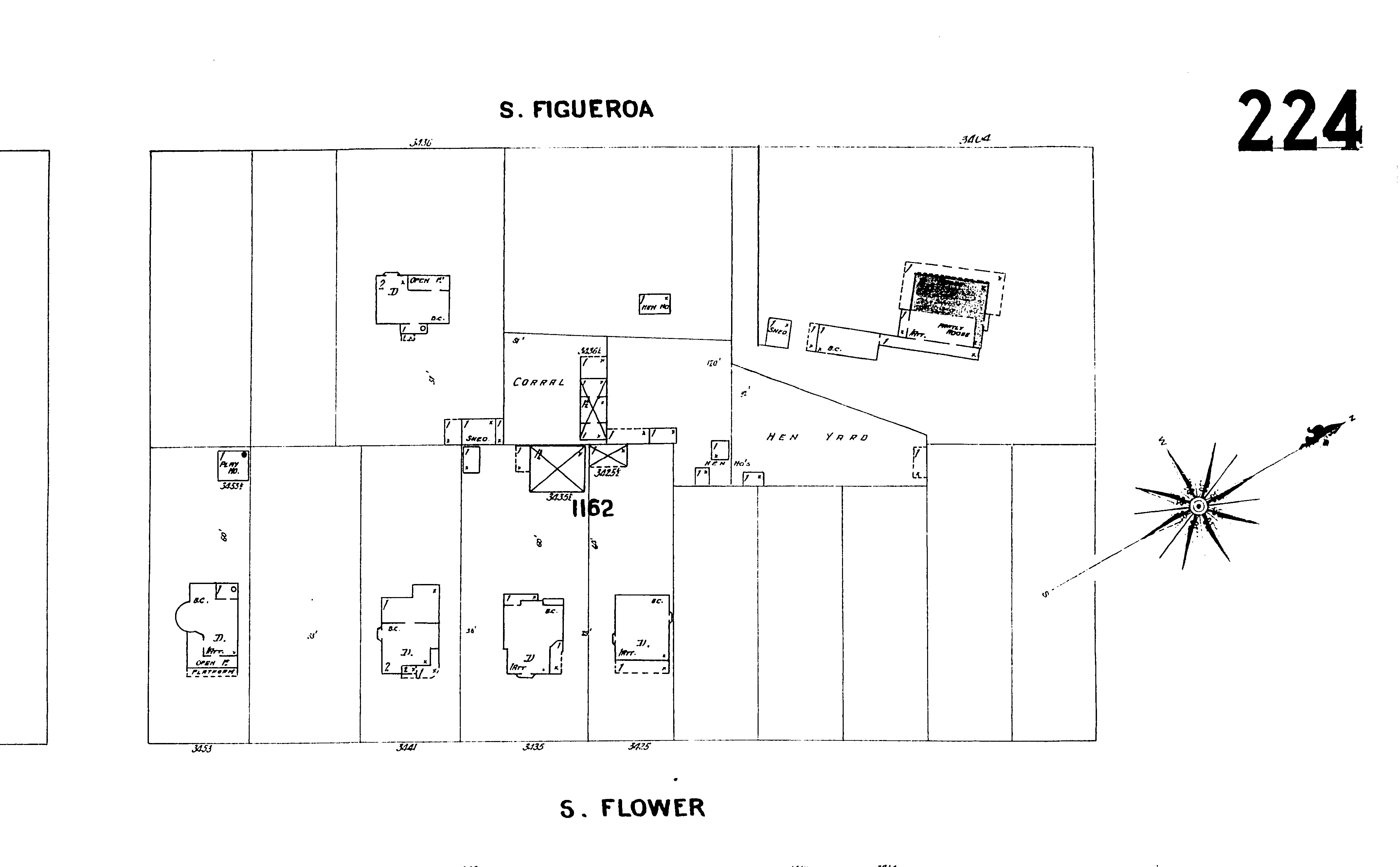 Figure 3: A Sanborn Map from 1900 shows the Casa Figueroa alone on a plot of land at the southeast corner of Figueroa and Jefferson. A hen house and corral are located next door. The house is described as “partly adobe”